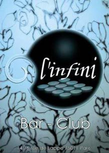 Bar à cocktail, bar à champagne, bar lounge, bar dj. Cet établissement crée en 2008 mélange les ambiances pour le plaisir de tous. Situé rue de Lappe, l'Infinity bénéficie d'une clientèle très large grâce à la réputation du quartier et cette rue. Ouvert tous les jours, sauf le lundi le lieu est appréciable en semaine et nettement plus fréquenté le week-end avec des soirées organisées régulièrement